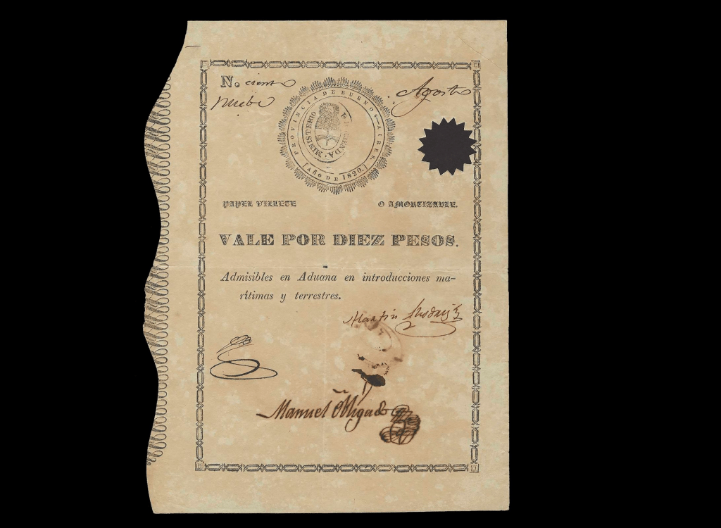 Lote 1795: Argentina. Buenos Aires. Ministerio de Hacienda. Vale de Aduana. Papel Billete 10 Pesos 1820. Número de serie manuscrito en texto. Valor en mayúscula con diseño y texto pequeño en cursiva. Tres firmas manuscritas. Diseño de borde tipo 1. Perforación estrellada de cancelación. Bauman VA-3d; Pick S108 (XF). Rarísimo ejemplar (R6), considerado como nuestro papel moneda precursor