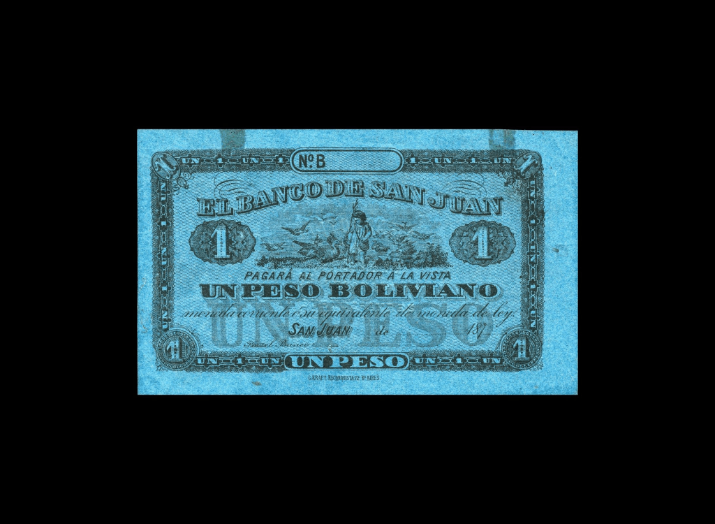 Lote 1851: Argentina. San Juan. El Banco de San Juan. 1 Pesos Boliviana 187_. Litografia G. Kraft. Bauman SJU-15 (R6) Bauman plate, el mismo; Not in Pick. (VF+) Con manchas y marcas de cintas