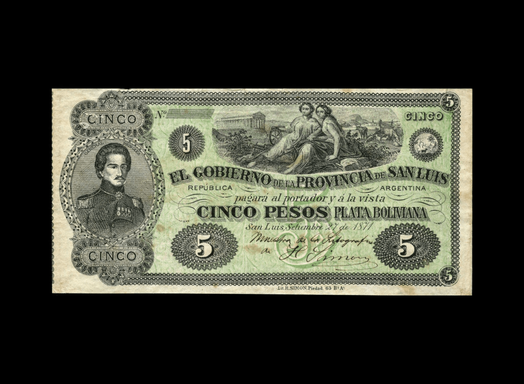 Lote 1857: Argentina. San Luis. El Gobierno de la Provincia de San Luis. Muestra Specimen 5 Pesos Plata Boliviana 1871. Firmado por H. Simón dueño de la litografia. Unifaz. Litografia M. Simón. Bauman SLU-6s (R7) Bauman plate, el mismo; Pick S1394 (VF+) Rarisima pieza, posiblemente única!