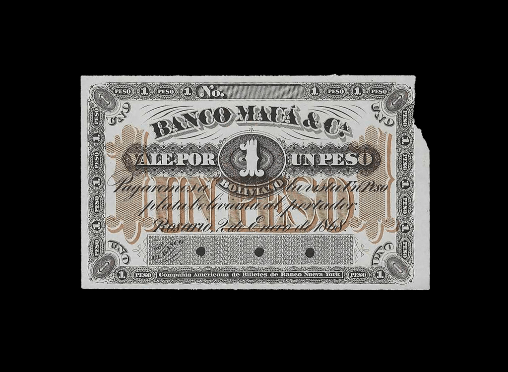 Lote 1866: Argentina. Santa Fe. Banco Maua & Ca, Rosario. Specimen 1 Peso Boliviano 1868 cancelado con tres perforaciones. Impresos en ABNC. Bauman SFE-30s (R5); Pick S1746s (XF). Pequeño faltante en esquina superior izquierda que no afecta el diseño