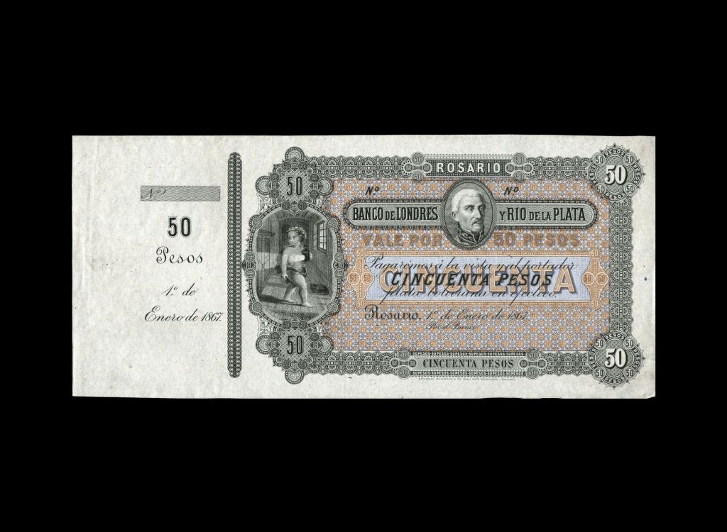 Lote 1858: Argentina. Santa Fe. Banco de Londres y Rio de la Plata, Rosario. Muestra de 50 Pesos Plata Boliviana 1867. Querubin y retrato de Gral. San Martin. Casa litográfica Bradbury, Wilkinson & Company. Bauman SFE-77s (R7) Bauman Plate, el mismo; Not in Pick (UNC) Billete extremadamente raro con viñeta del Gral San Martín