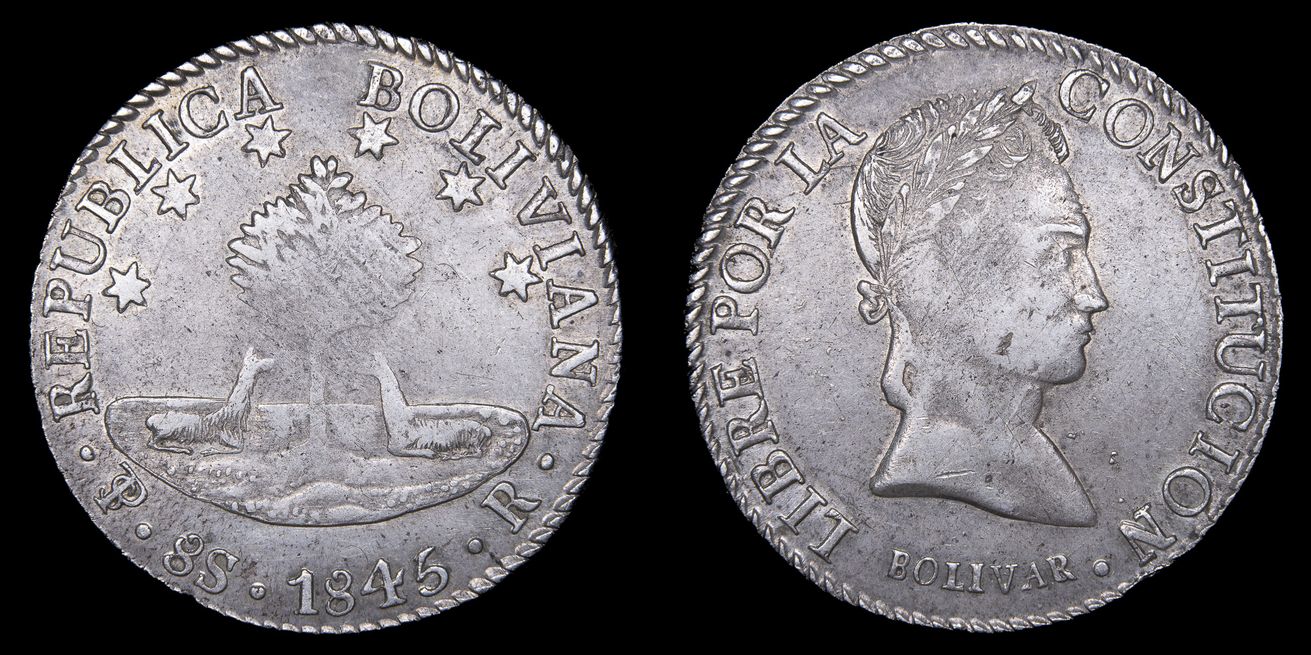 Lote 322. Bolivia. 8 Soles 1845 R. Simón Bolivar. Plata 903; 37.0mm; 26.85. KM103 Giro medalla (VF). Est. 100-150