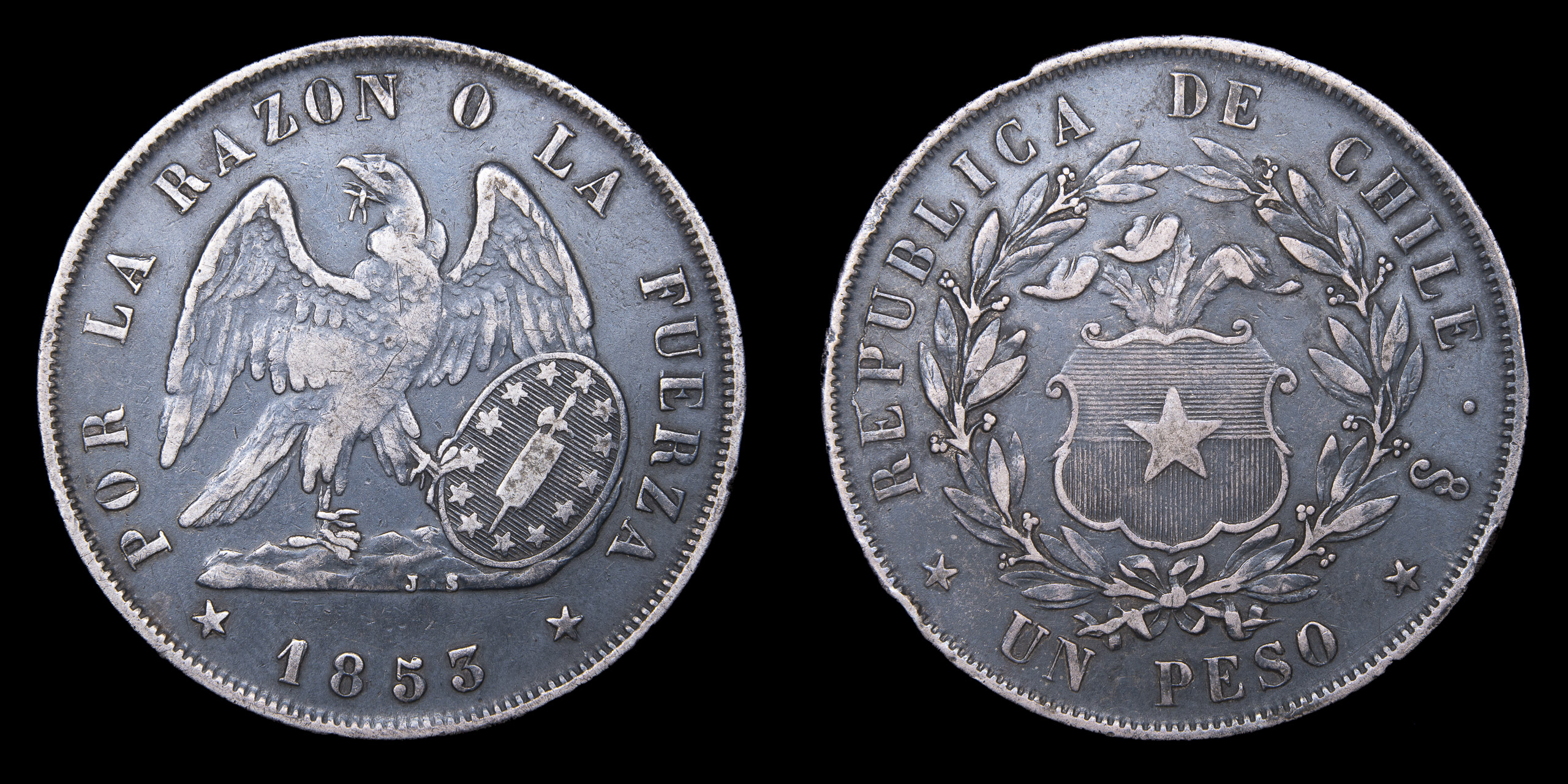 Lote 383. Chile. 1 Peso 1853 So. Santiago mint. Plata 900; 37.0mm; 24.88g. Cóndor. KM129 (XF). Est. 300-400