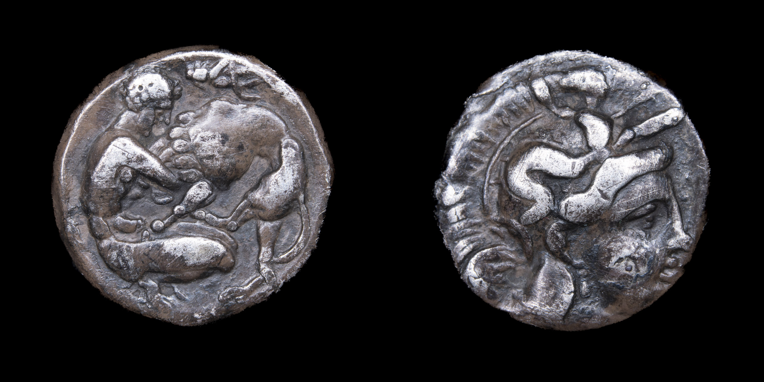 Lote 664. Tarentum, Calabria (c.380-325BC) Diobol. Silver; 12mm; 1.00g A: Head of Athena to right, wearing crested Attic helmet decorated with Skylla. R: Herakles crouching to right, strangling the Nemean lion; club to left, grasshopper above. Vlasto 1327; cf. HN Italy 976; cf. HGC 1, 834 (VF). Est. 100-200