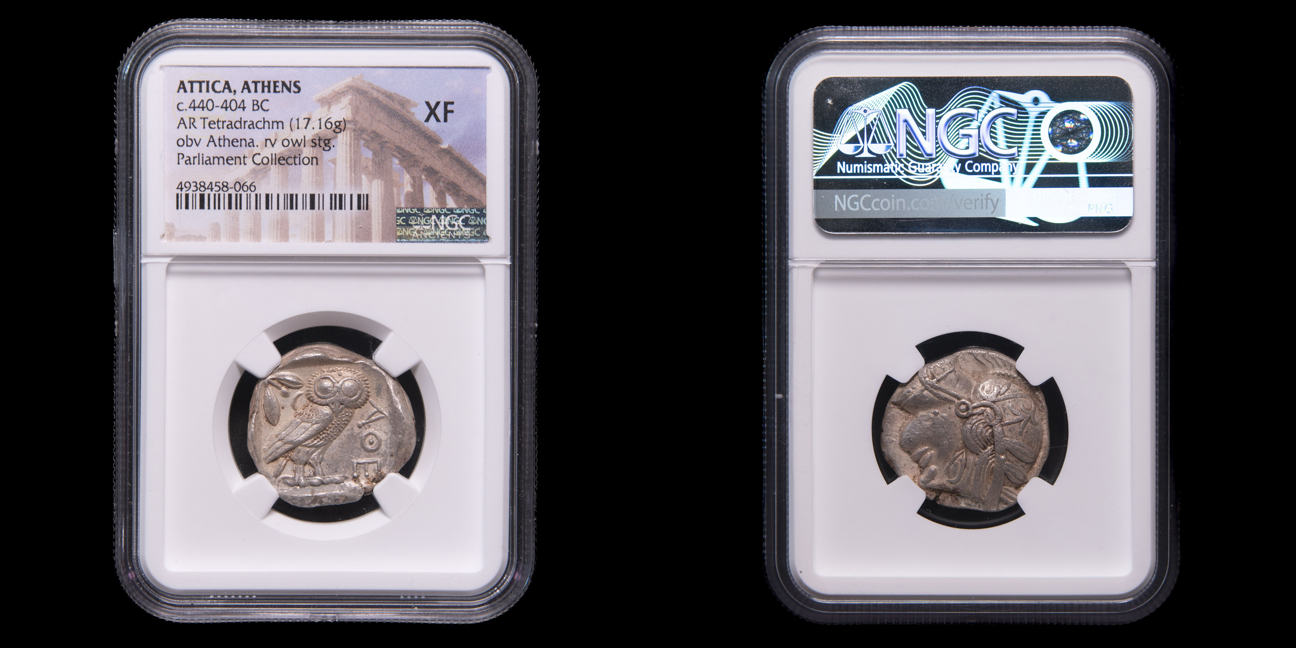 Lote 668. Athens (Attica, 440-404BC) Tetradrachm. Silver; 24.0mm; 17.16g. A: Head of Athena right, wearing crested Attic helmet ornamented with three laurel leaves and vine scroll. R: ΑΘΕ, owl standing right, head facing, olive sprig and crescent moon behind, all within incuse square. SNG Cop 46; HGC4 1597. Ex Parliament Collection. Certificated NGC Ancient XF. Est. 800-1200