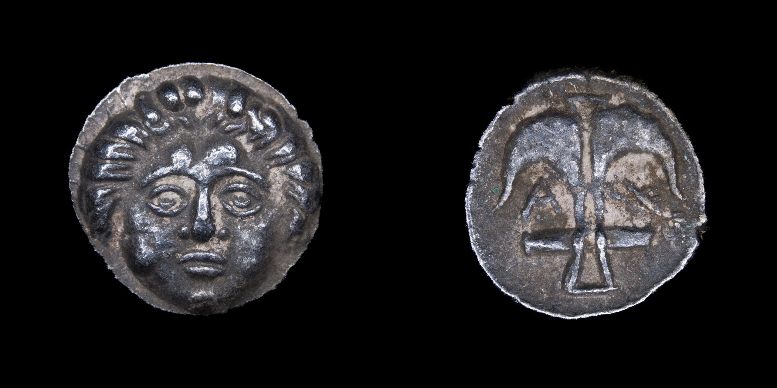 Lote 688. Apollonia Pontika, Thrace (Later 4th Century BC) Diobol. Silver; 10mm; 1.34g. A: Gorgoneion. R: Anchor, flukes upward, A on left, crayfish on right. SNG Black Sea 169–173 (VF+). Est. 100-200