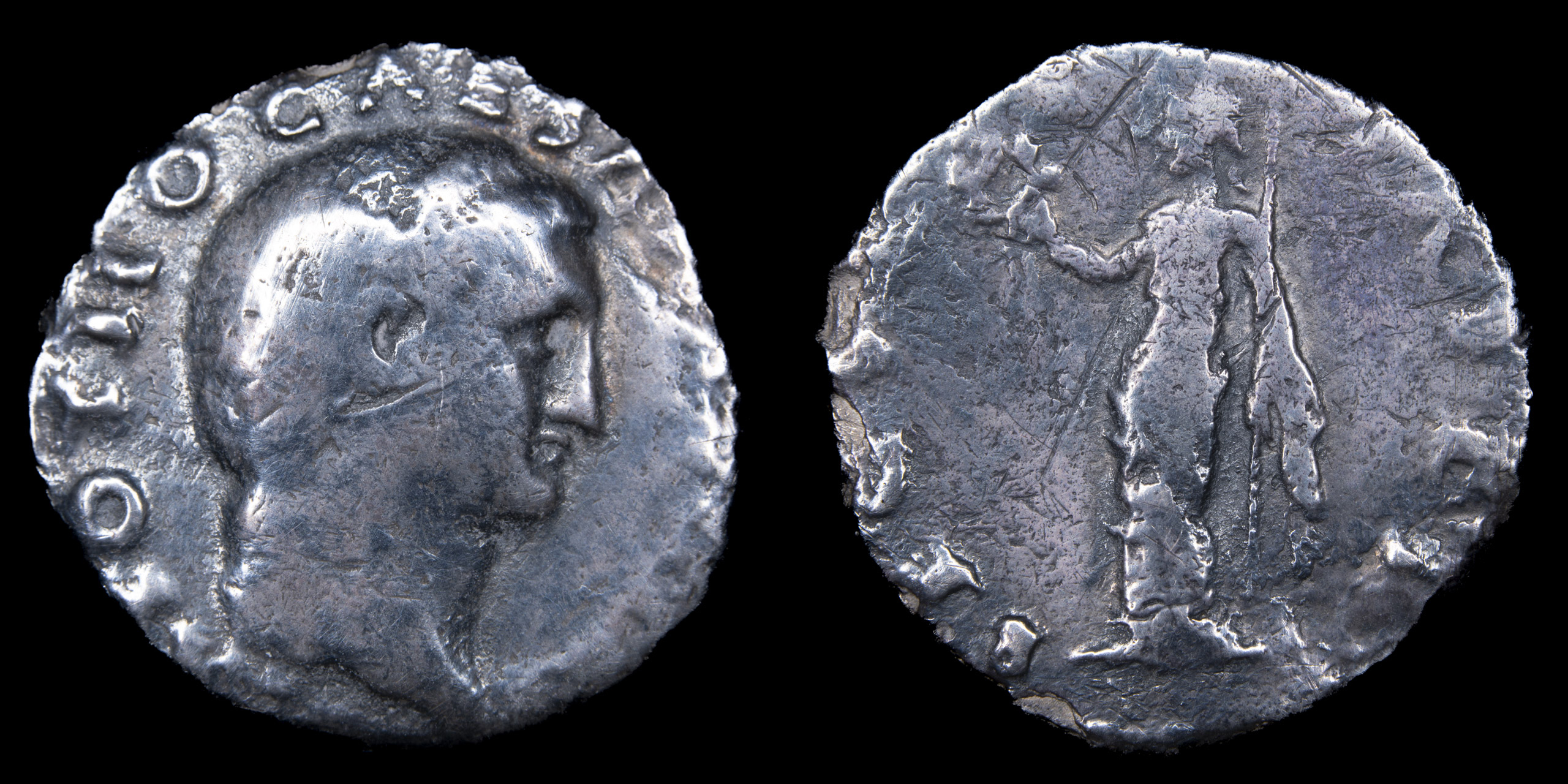 Lote 741. Otho ( Jan-Apr 69AD) Denarius. Silver; 18mm; 2.66g. A: IMP OTHO CAESAR AVG TR P, bewigged head right. R: SECVRITAS P R, Securitas standing left, holding wreath and sceptre. RIC I 10; RSC 15 (F). Est. 400-600