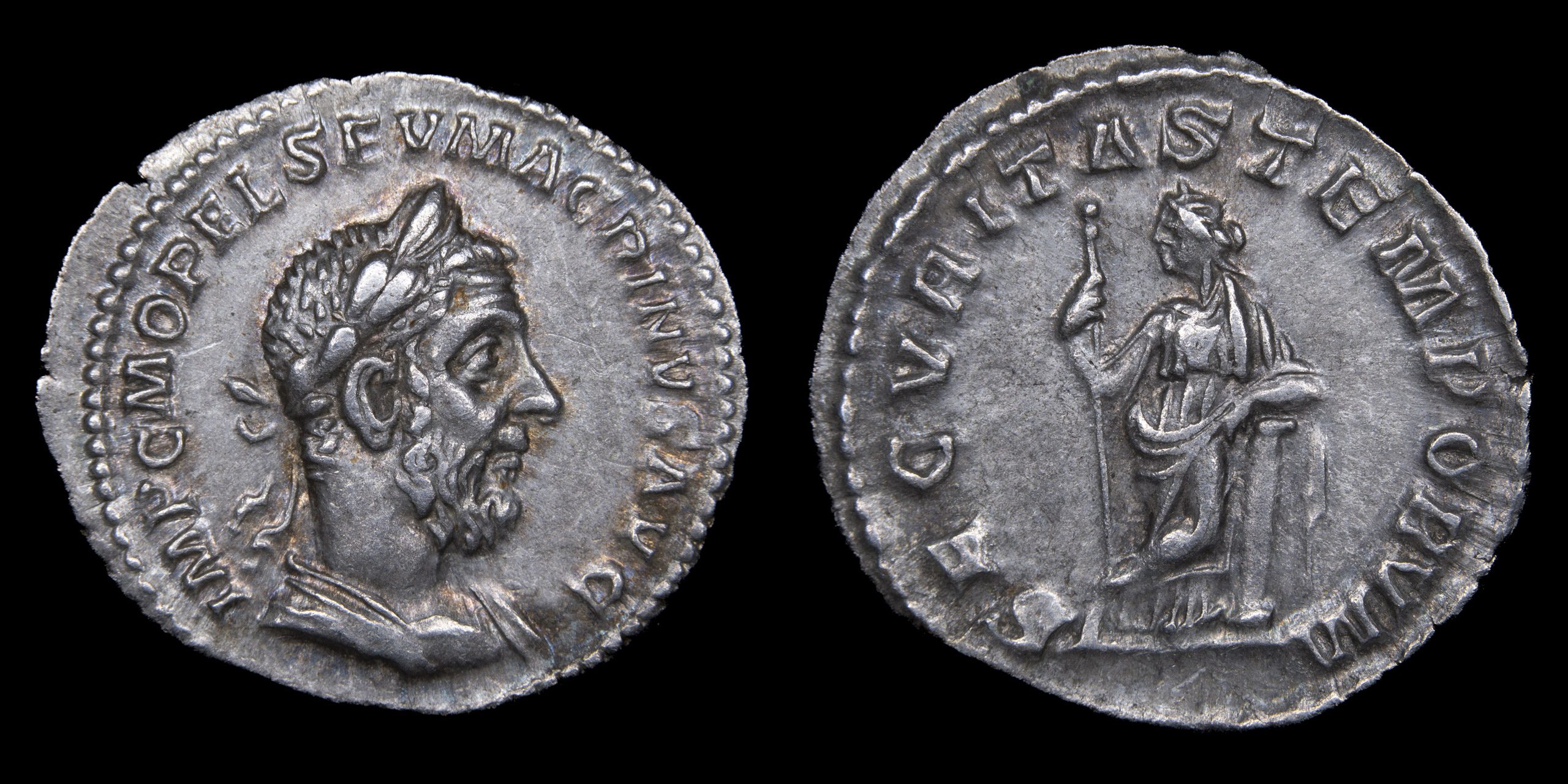 Lote 805. Macrinus (217-218AD) Denarius. Rome mint. Silver; 20.0mm; 2.78g. A: IMP C M OPEL SEV MACRINVS AVG, Laureate and cuirassed bust right. R: SECVRITAS TEMPORVM, Securitas standing facing, head left, leaning on column to right and holding sceptre. RIC IVb 91; RSC 122c; Sear 7365. (XF). Est. 200-300