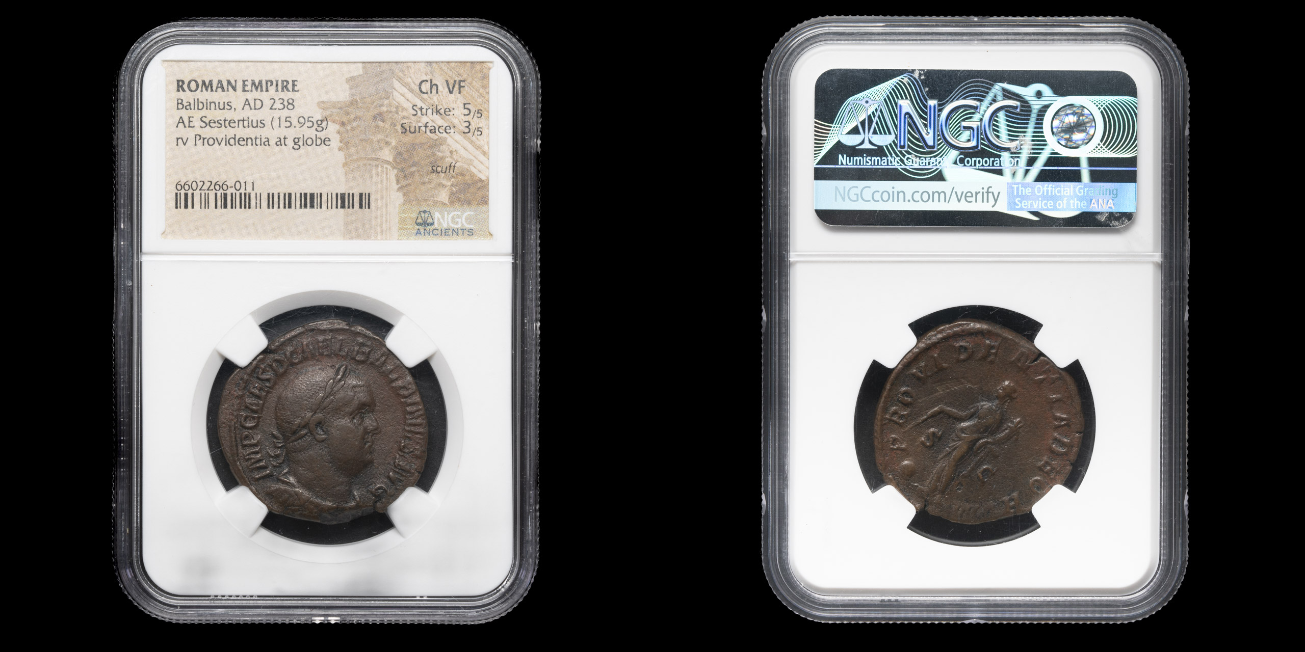 Lote 818. Balbinus (238 AD) Sestertius. Bronze. A: IMP CAES D CAEL BALBINVS AVG Laureate, draped and cuirassed bust of Balbinus to right. R: PROVIDENTIA DEORVM / S – C, Providentia standing left, holding cornucopia in her left hand and wand in her right; at her feet to left, globe. RIC IV.b 19. Certified by NGC Ch VF. Est. 700-1000