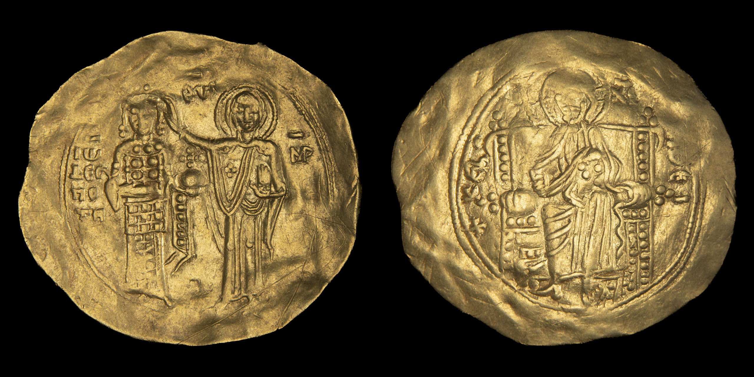 Lote 934. Byzantine. John II Comnenus (1118-1143AD) Hyperpyron. Constantinopolis mint. Gold; 31mm; 4.50g. A: Christ nimbate, seated facing on throne, with tunic and pallium, raising his right hand in benediction and book of Gospels in his left; to left and right, IC – XC. R: ΙⲰ / ΔЄC/ΠΟ/ΤΗ On the left, John II Comnenus standing facing, wearing crown and loros and holding globus cruciger in his left hand; on the right, the Virgin, wearing robes, crowning the emperor with her right hand and holding maphorion in her left; above and in the field to right, ΘV – MP. SB 1940. Minor scratches and a few graffitis, flattened flan (VF). Est. 400-600