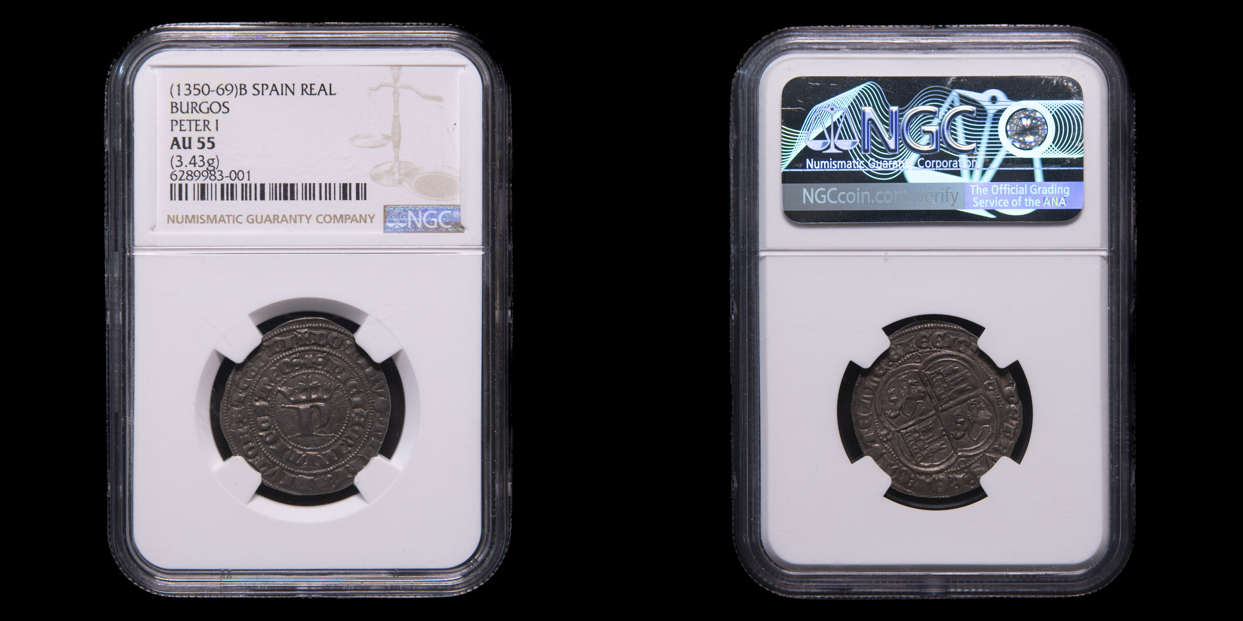 Lote 945. Spain. Castille & Leon. Pedro I (1350-1369AD) AR 1 Real ND. Burgos mint. Silver; 26.0mm; 3.43g. Cy 1289; AB380. NGC AU55. Est. 450-600