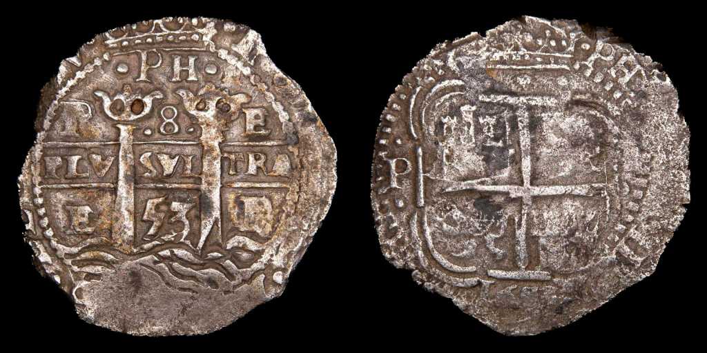 Lote 46. Potosí. Felipe IV (1621-1665) 8 Reales 1653 E (Antonio de Ergueta) Macuquina. Plata 930; 39mm; 22.57g. CJ 23.1.3 (A2-R9) Doble fecha, ceca y ensayador visibles (VF+)