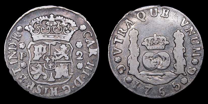 Lote 13. Guatemala. Carlos III (1759-1788) 2 Reales 1765 P. Columnaria. Plata 917; 27.5mm; 6.46g. KM25. (VF)