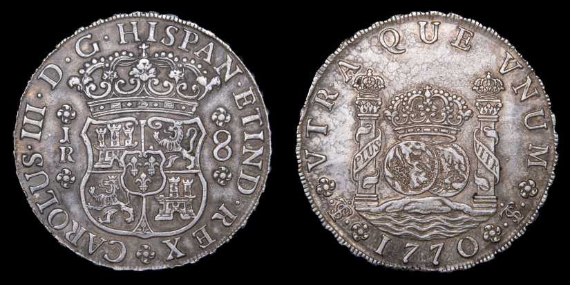 Lote 50. Potosí. Carlos III (1759-1788) 8 Reales 1770 JR (José Vargas y Flor y Raimundo de Yturriaga) Tipo Columnario. Plata 917; 39.6mm; 27.0g. CJ 58.4.3; KM 50. Vuelta y media de cerrilla en el canto que produce un bello efecto de sobreacuñación. (AU+)
