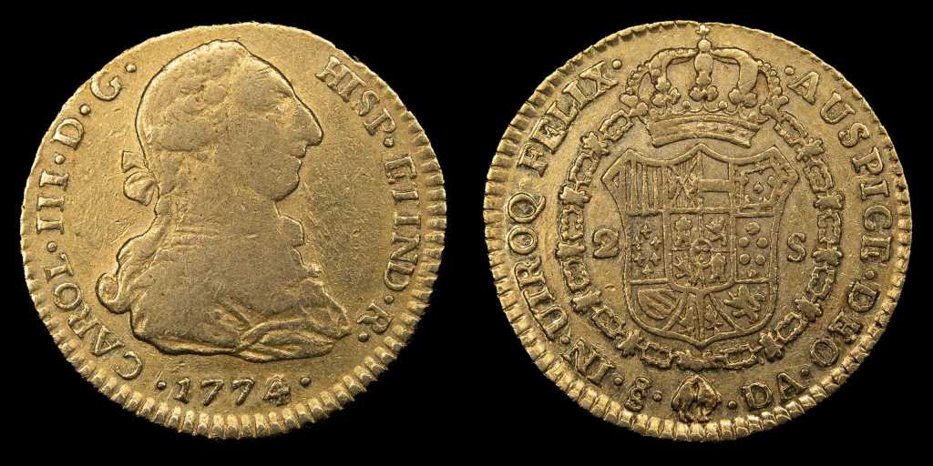 Lote 2. Santiago. Carlos III (1759-1788) 2 Escudos 1774/3 DA. Clara e interesante sobrefecha en una acuñación de tan solo 3026 piezas acuñadas. Oro 904; 22mm; 6.7g. KM32 (VF)