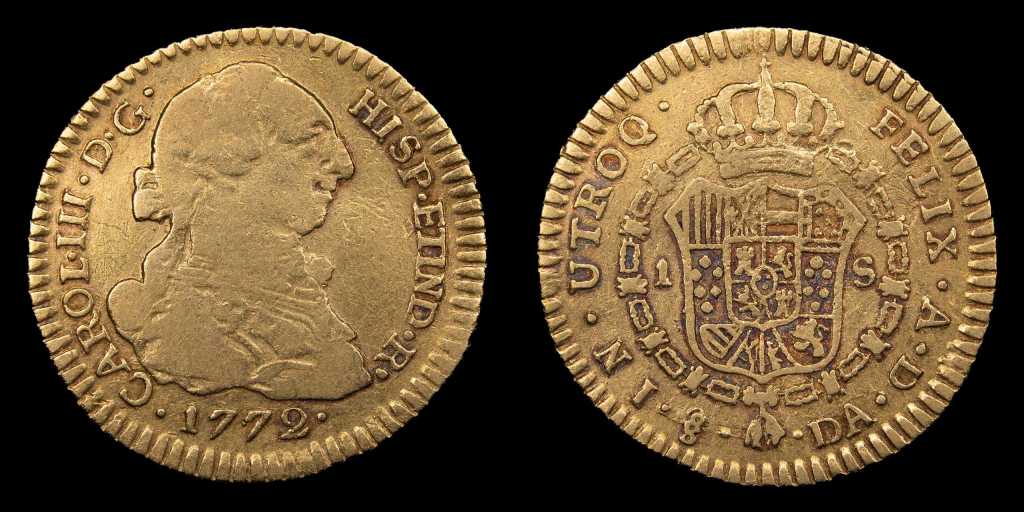 Lote 1. Santiago. Carlos III (1759-1788) 8 Escudos 1773 DA. Cantidad acuñada: 33.000 unidades. Oro 901; 38.0mm; 26.97g. KM27 (VF)
