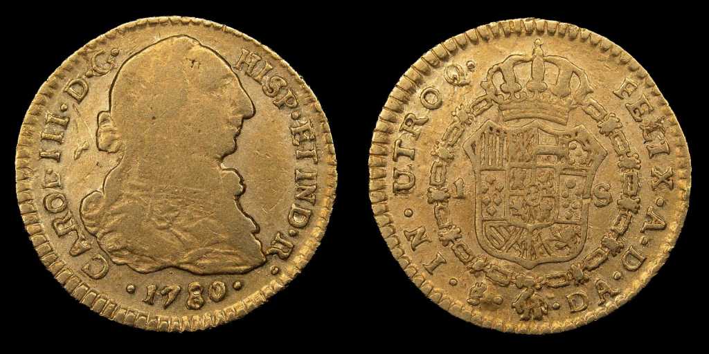 Lote 4. Santiago. Carlos III (1759-1788) 1 Escudo 1780 DA. Muy escasa. Oro 904; 19mm; 3.34g. KM26 (VF)