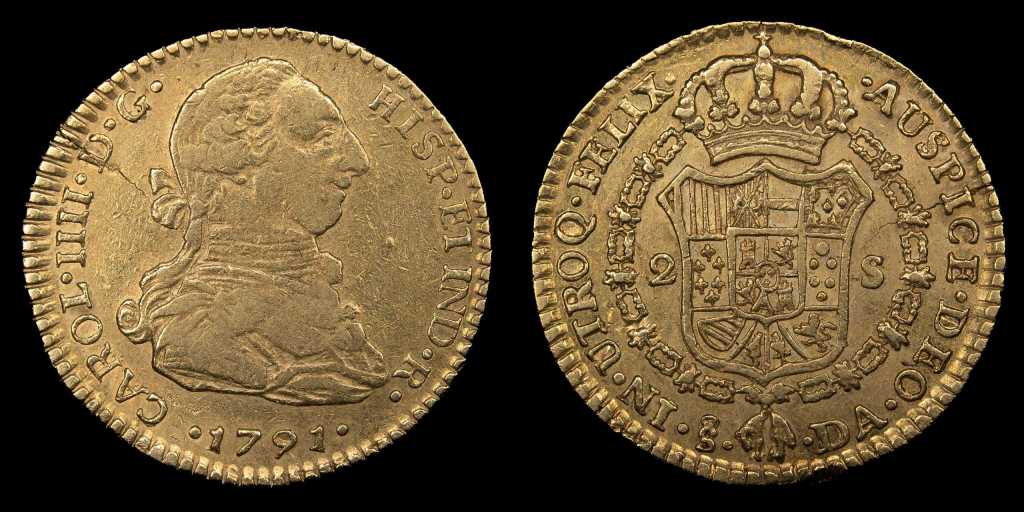 Lote 5. Santiago. Carlos IV (1788-1808) 2 Escudos 1791 DA. Busto transicional. Muy escasa. Oro 904; 22mm; 6.75g. KM53 (VF+)