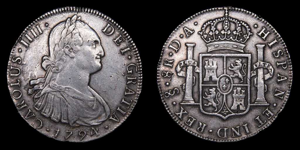 Lote 6. Santiago. Carlos IV (1788-1808) 8 Reales 1794 DA. Plata 896; 39mm; 26.40g. KM51 (VF) Signos de corrosión