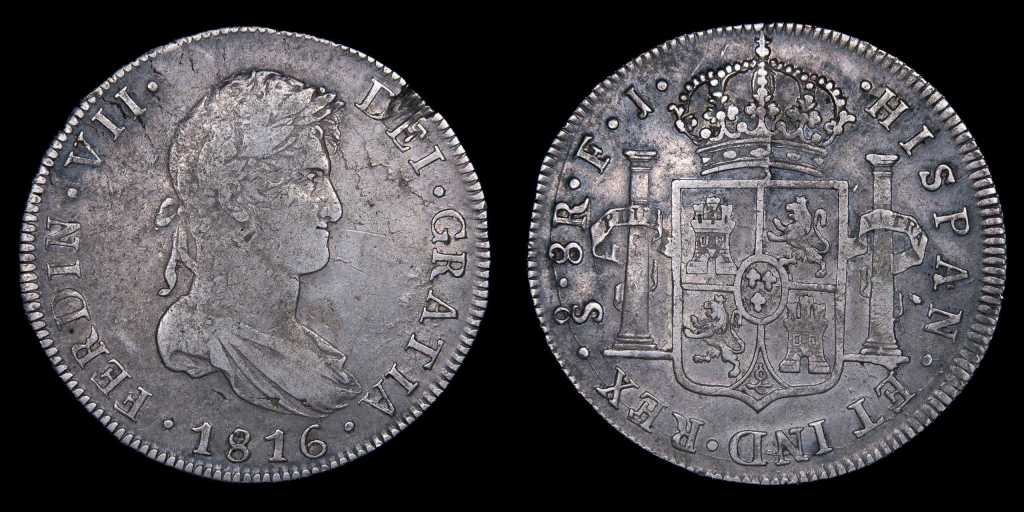 Lote 9. Santiago. Fernando VII (1808-1833) 8 Reales 1816 FJ. Cantidad acuñada: 386.000 unidades. Plata 896; 41.0mm; 27.52g. KM80. (VF) Defecto de cospel a las 2.00