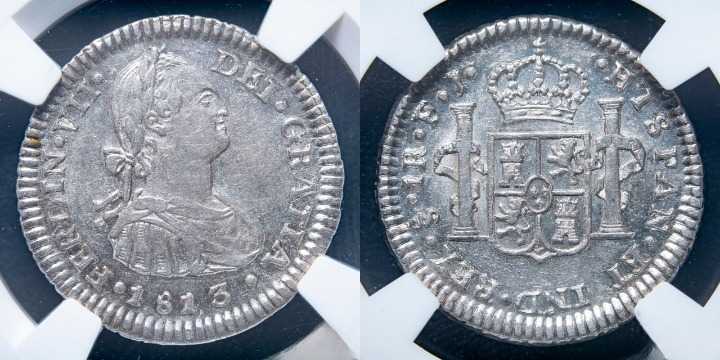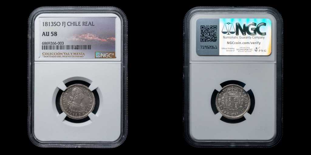 Lote 11. Santiago. Fernando VII (1808-1833) 1 Real 1813 FJ. Posible sobrefecha. Busto transicional de Carlos IV. Plata 896; 21mm. MC#2R43; KM65. Certificada por NGC AU58, aunque la moneda no presenta signos de circulación, apenas algunos detalles más flojos por debilidad de cuño