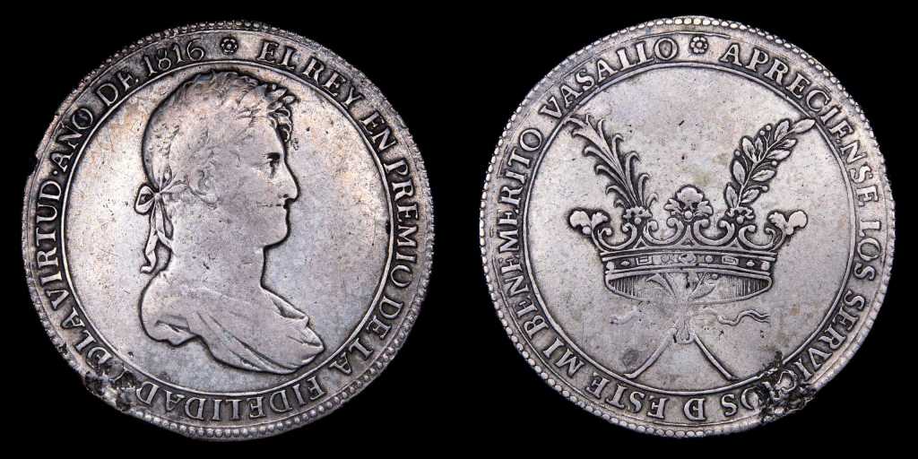 Lote 809. Potosí. Fernando VII (1808-1833) Premio a la Fidelidad y Virtud 1816. Plata 875; 40mm; 25,18g. A: EL REY EN PREMIO DE LA FIDELIDAD Y DE LA VIRTUD · AÑO DE 1816. R: APRECIENSE LOS SERVICIOS DE ESTE MI BENEMERITO VASALLO. Fonrobert 9401; Cunietti-816-01-02. Ex colección Cunietti, pieza ilustrada en su libro “Historia de las Medallas Argentinas 1747 – 1880” p.57 Ex RPN 9 Lot 608. (VF) Daño de cospel, argolla retirada a las 12 como es habitual en estas piezas, le rehicieron las estrias del canto manualmente, muy rara