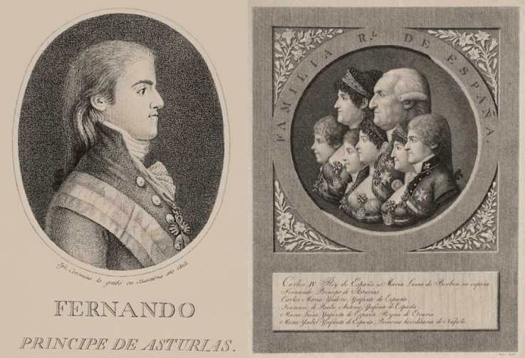 En el caso de la ceca de Santiago, donde operaba el talla mayor Ignacio Fernández Arrabal, acuña algunas denominaciones a nombre de Fernando con el retrato de su padre, y en otros usando un retrato tipo imaginario, pero que respeta con bastante fidelidad las características de su fisonomía. Este retrato, conocido como de tipo «Almirante», tiene su antecedente en la medalla grabada para la Jura de Fidelidad de Buenos Aires de 1808 , y podría tener su origen en el grabado de 1802 de José Coromina Faralt (como Principe de Asturias) o bien en el que se encuentra en primer plano junto a la familia real (c. 1800) de Roch-Jean Baptiste Donas, ilustrados ambos a continuación: