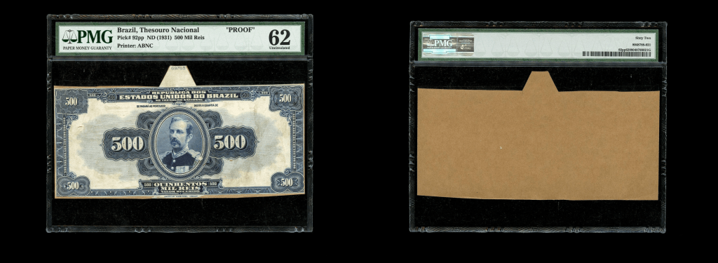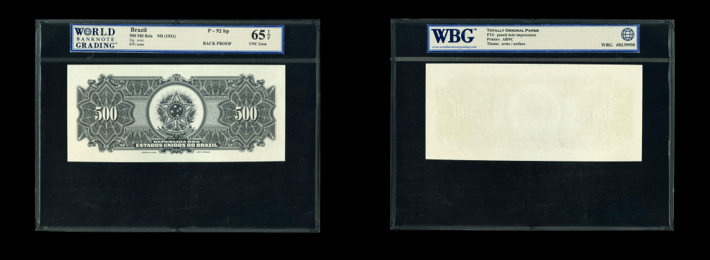 Lote 1609. Brasil. Republica dos Estados Unidos do Brasil, Thesouro Nacional. Front & Back Proof 500.000 Reis ND1931. Prueba de anverso montada en cartulina. Impreso en ABNC. Pick 92fp. Anverso Certificado PMG 62 Uncirculated y reverso Certificado WBG 65 UNC Gem