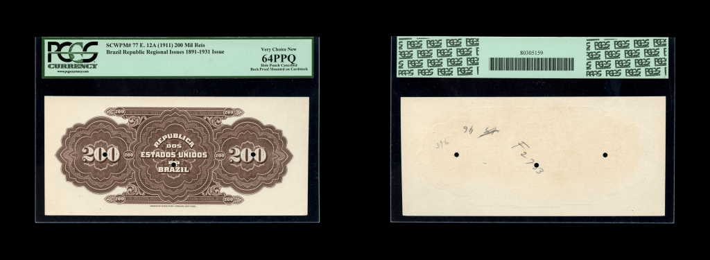 Lote 1601. Brasil. Republica dos Estados Unidos do Brasil, Thesouro Nacional. Front & Back Proof 200 Mil Reis ND1911, Estampa 12a. Pruebas de anverso y reverso montadas en cartulina con perforaciones de cancelación. Pick A77Ef-p. Impresos en ABNC. Certificado PCGS 64PPQ Very Choice New (ambas pruebas)