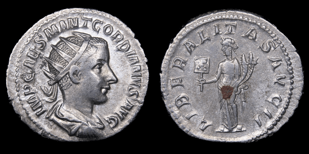 Gordiano III, es nombrado emperador por ser nieto de Gordiano I, uno de los generales africanos que enfento el golpe de estado de Maximino el Tracio. En extrañas circunstancias parece haber sido asesinado por Filipo I, su prefecto del pretorio, quien asume la púrpura. Les traemos piezas de ambos emperadores: