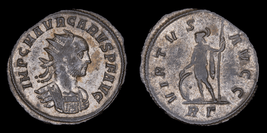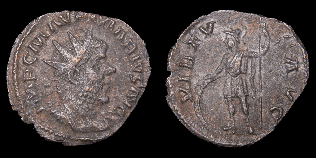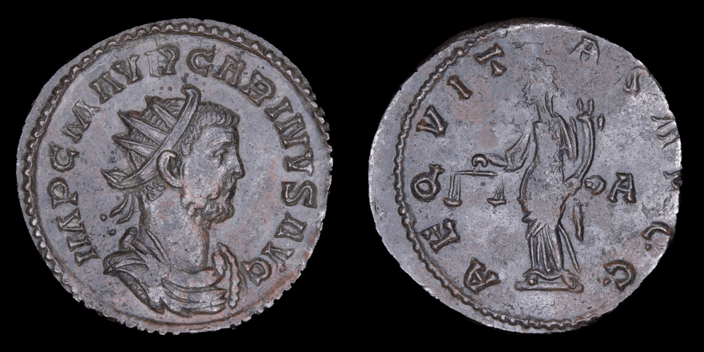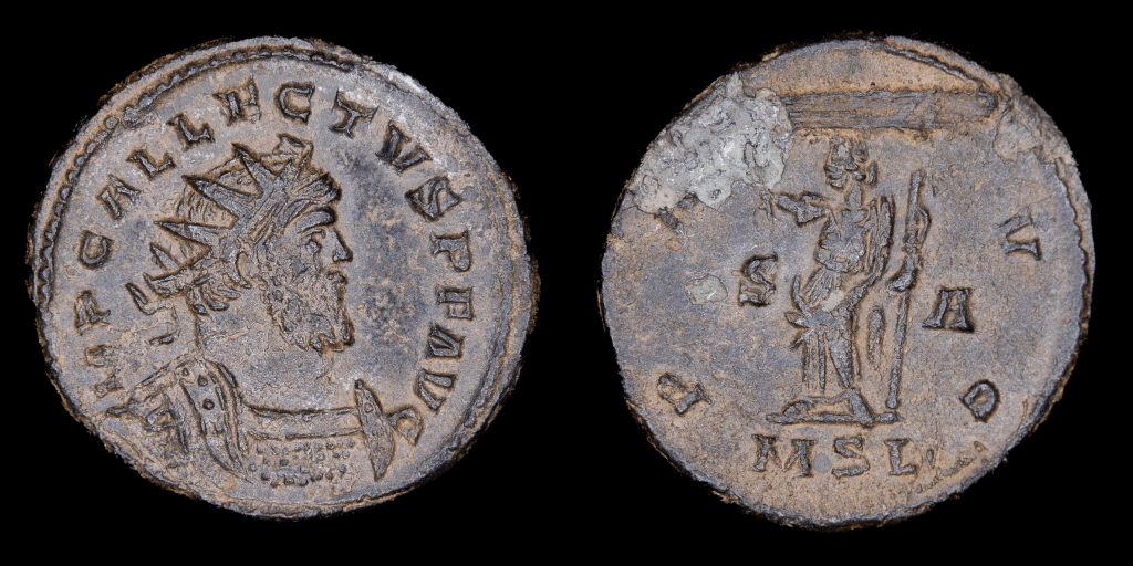 En tiempos de Diocleciano y Maximiano, Carausio, general menapio se rebeló en la Britania, fue nombrado emperador y gobernó unos siete años hasta ser asesinado por el que era su minitro de eonomía: Alecto. Les traemos en esta oportunidad un Antoniniano de Alecto, es decir, de las escasas piezas brevemente acuñadas con el sistema monetario de Carausio (y del imperio central) previo a la reforma que introduciria una pieza radiada más pequeña: