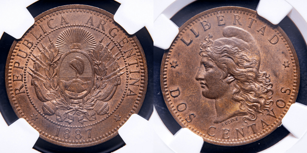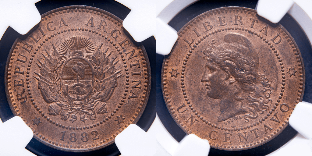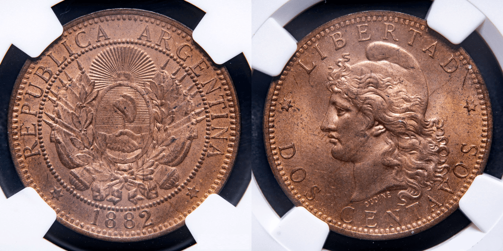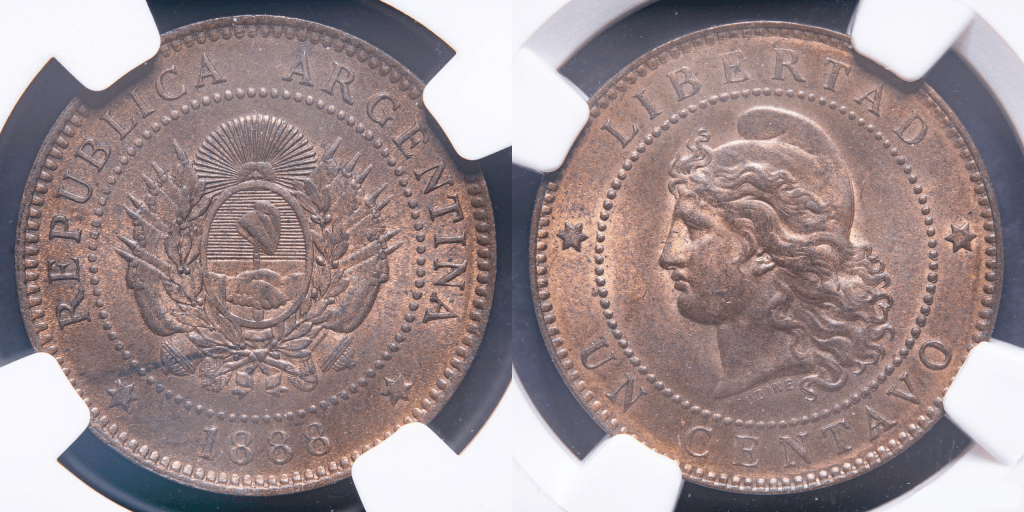 En cobre tambien tenemos piezas importantes, destacándose un 2 Centavos 1882 TOP POP, certificada NGC MS64 RB, un 2 Centavos 1887 TOP POP, certificada NGC MS63 BN. También tenemos una pieza de 1 Centavo 1882, la fecha más escasa de la serie, con solo 108.202 unidades acuñadas, 1 Centavo 1886, fecha en la que solo se acuñaron 443.700 unidades y 1 Centavo 1888 con solo 413.300 unidades, entre otras hermosas piezas de la serie, vamos a continuación con la seleccion comentada: