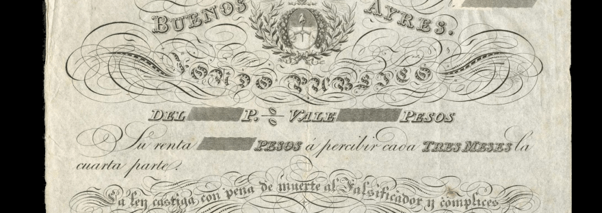 Entre 1816 y 1820 una forma de financiar el estado de Buenos Aires fue a través de los bonos de Fondos Públicos, pagadero al portador cada 3 meses el 6%. Hoy destacaremos de esta emisión 2 rarísimos ejemplares. El primero de 1000 pesos canjeado (por eso el corte triangular) y el segundo un remanente.