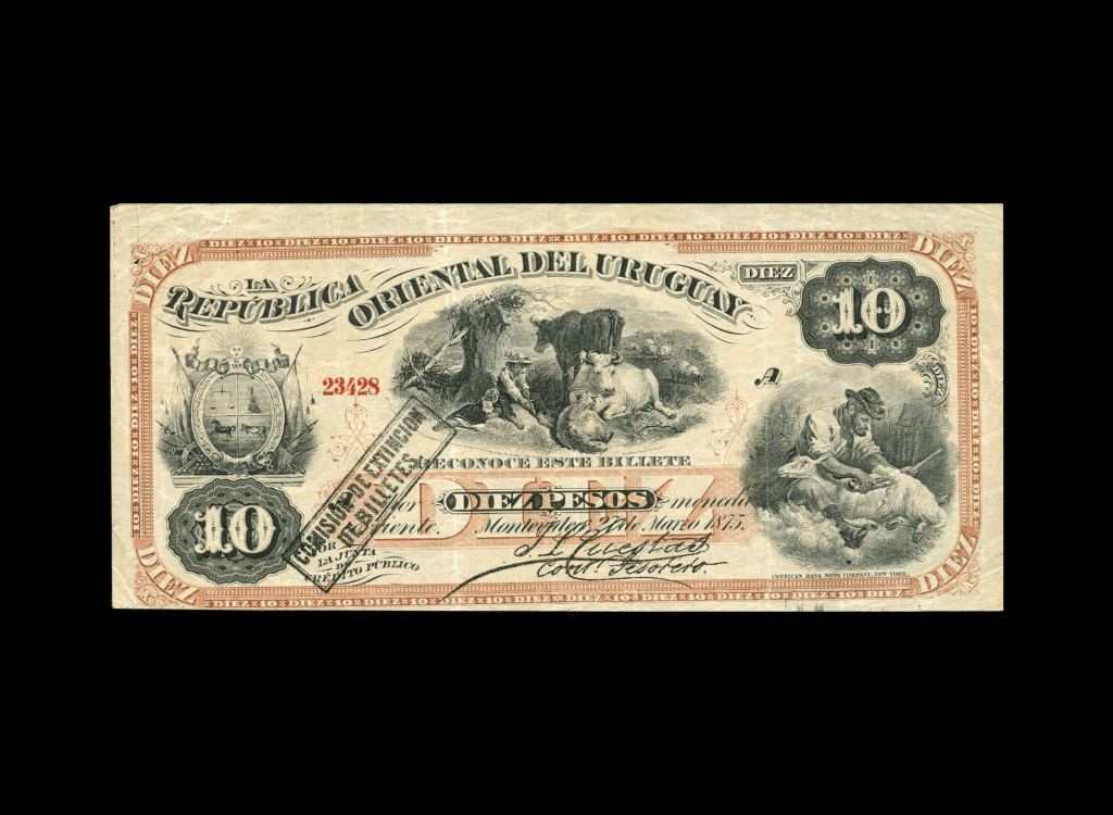 Lote 2105. Uruguay. La República Oriental del Uruguay. Comisión de Extinción de Billetes. 10 Pesos 1875, Serie A N°23428. Resello negro de la Comisión. Impreso en ABNC. Pick A104 (XF)