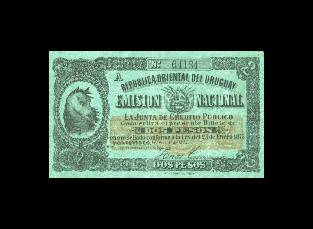Lote 2108. Uruguay. República Oriental del Uruguay. Emisión Nacional. Junta de Crédito Público. 2 Pesos 1875, Serie A N°64184. Impreso en Hequet & Cohas Hnos. Pick A118a (VF)