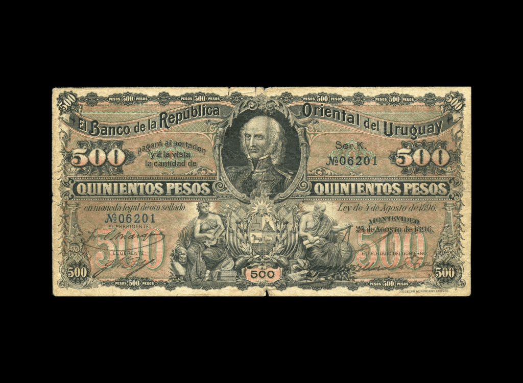 Lote 2110. Uruguay. El Banco de la República Oriental del Uruguay. 500 Pesos 1896, Ley Agosto 1896, serie K N°06201, firmado. Firmas: Marqués, West y Zorrilla de San Martín. Impresos en Giesecks & Devrient, Leipzig. Pick 8; ROT R# 2.VIII.2 (R6) (VF)