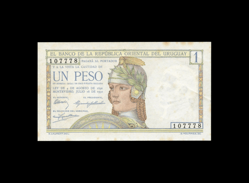 Lote 2113. Uruguay. El Banco de la República Oriental del Uruguay. 1 Peso 1930, serie N°107778. Firmas: Morató, Gallinol y Zorrilla de San Martín. Pick 17; ROT R# 6.III (AU) manchitas de óxido en los bordes