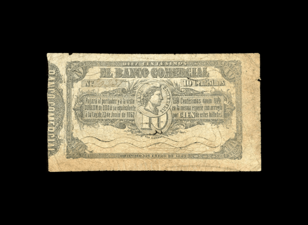 Lote 2081. Uruguay. El Banco Comercial, Montevideo. 10 Centésimos 1863, firmado y Serie N°20231. Impreso en Hequet y Cohas hnos. Pick S121 (F) Extremadamente raro