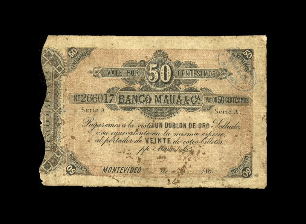 Lote 2085. Uruguay. Banco Maua & Ca, Montevideo. 50 Centésimos 1863, Serie A N°266017. Resello azul AGENCIA BANCO MAUA &Ca * MERCEDES*. Impreso en BWC. Pick S262 tipo (VF). Muy raro, agencia no listada en Pick