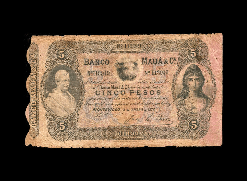 Lote 2089. Uruguay. Banco Maua & Ca, Montevideo. 5 Pesos 1876, Serie N°118949. Firmado. Impreso en BWC. Pick S305 (F)