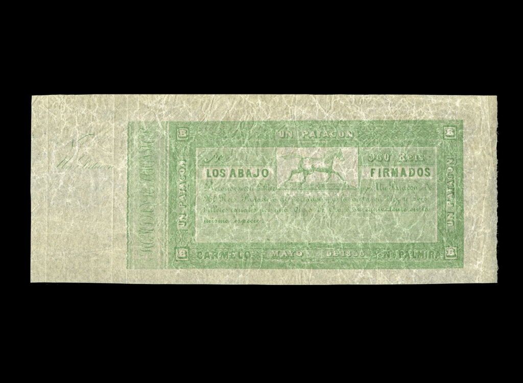 Lote 2090. Uruguay. Banco Carmelo y Na Palmira. Los Abajo Firmados. 1 Patacon = 960 Reis, 1856 Remainder. Not in Pick (VF)