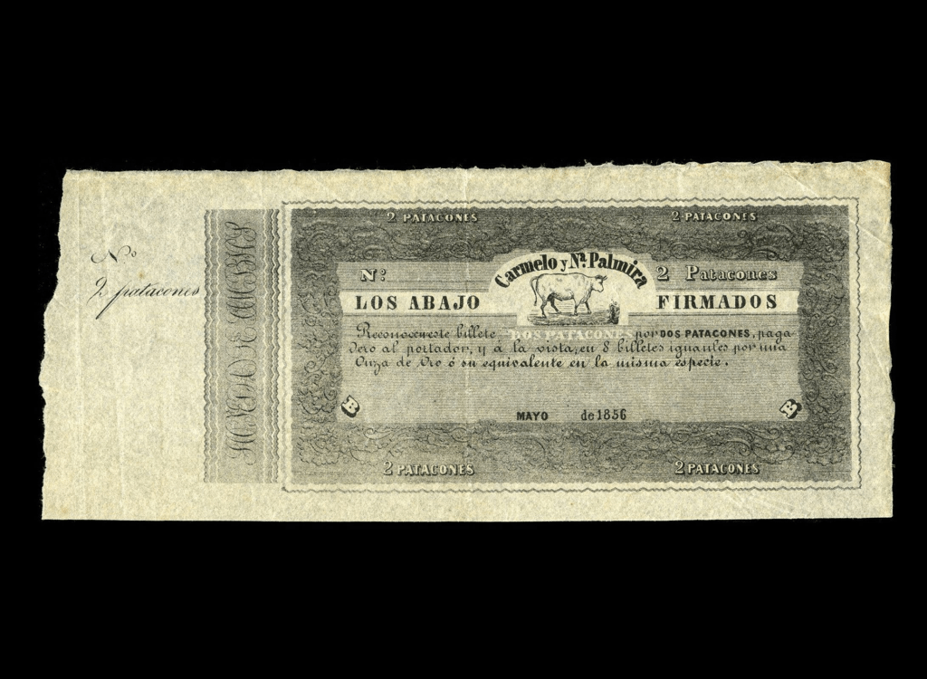 Lote 2091. Uruguay. Banco Carmelo y Na Palmira. Los Abajo Firmados. 2 Patacones 1856 Remainder. Not in Pick (XF)