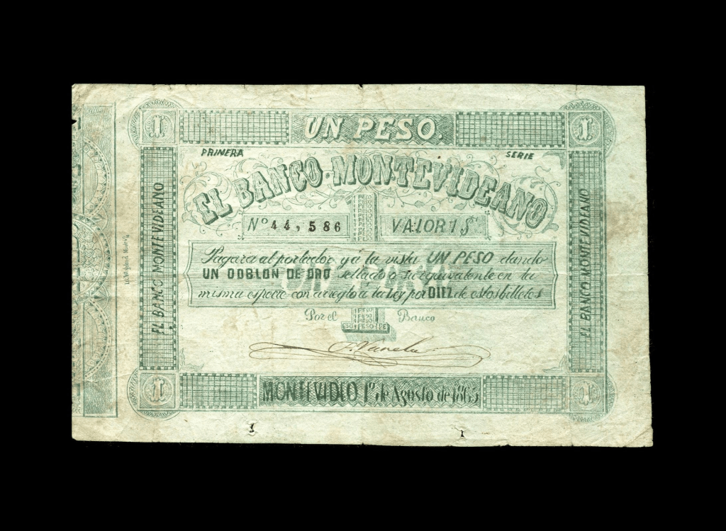 Lote 2092. Uruguay. El Banco Montevideano. 1 Peso 1865, Serie primera N°44586. Firmado. Impreso en Wegelend, Montevideo. Not in Pick (F+) Billete extremadamente raro, muy pocos ejemplares conocidos