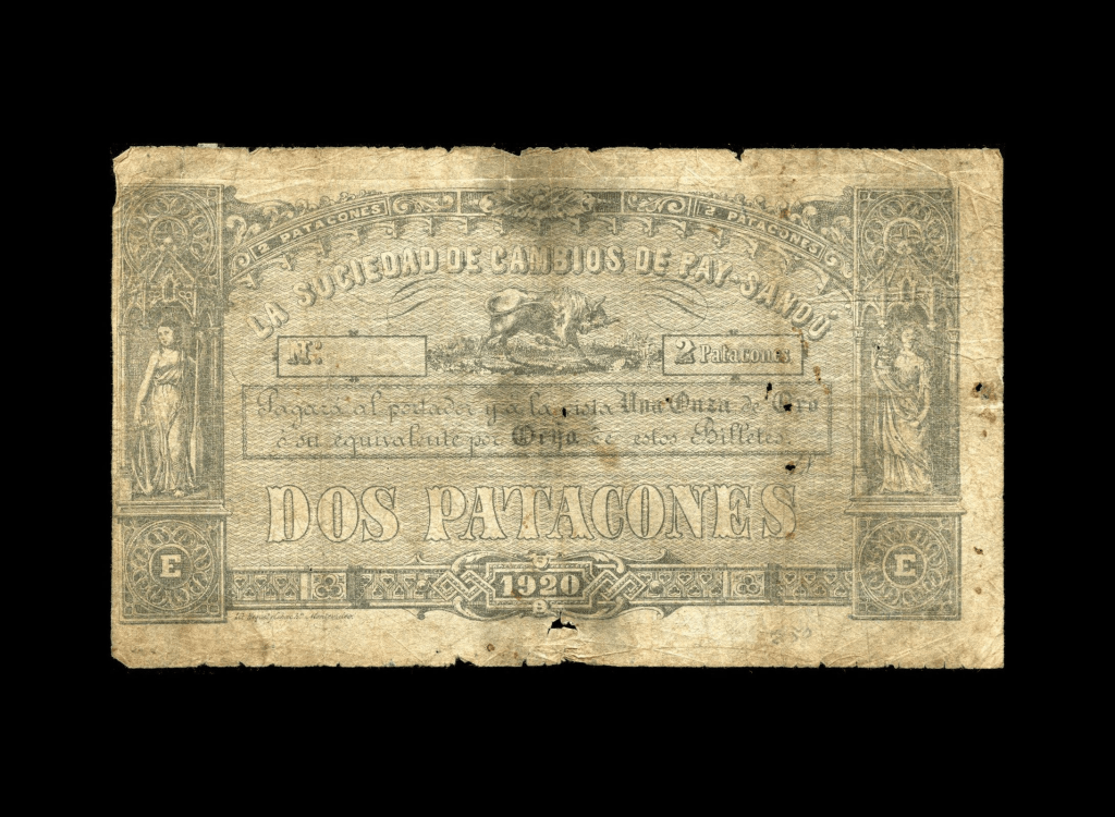 Lote 2094. Uruguay. La Sociedad de Cambios de Paysandú. 2 Patacones remainder, equivalente a 1920 Reis, serie E. Impreso en Hequet y Cohas hnos. Pick S469 (VG) Extremadamente raro