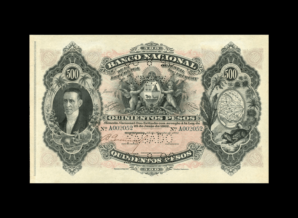 Lote 2101. Uruguay. Banco Nacional de la República Oriental del Uruguay. 500 Pesos 1887, Serie A N°002052. Cancelado con perforación PAGADO 25.8.96. Impreso en Waterlow & Sons. Pick A98b (AU)