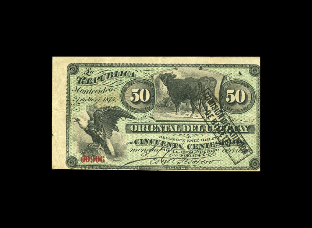 Lote 2103. Uruguay. La República Oriental del Uruguay. Comisión de Extinción de Billetes. 50 Centésimos 1875, Serie A N°00906. Resello negro de la Comisión. Impreso en ABNC. Pick A100 (VF) restos de pegamento en reverso