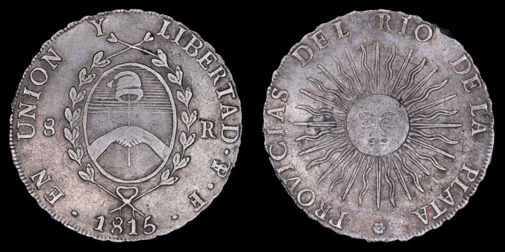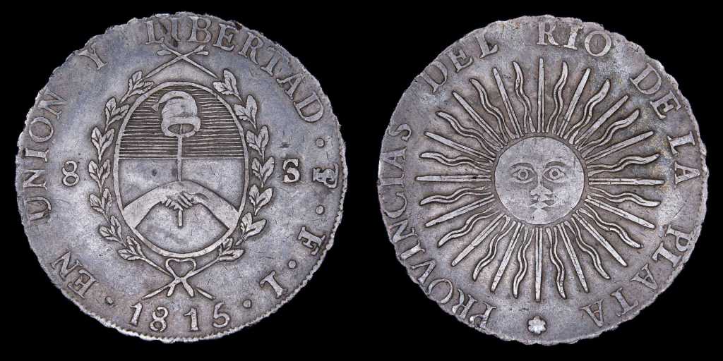 Lote 168. Argentina. Provincias Unidas del Río de la Plata. 8 Reales 1815 F (Francisco José de Matos). Casa de Moneda de Potosí. Plata 896; 38.5mm; 26.66g. Cantidad acuñada: 922.426 unidades (Incluyendo 8 Soles 1815). CJ 5.1.10 (A5-R12) (R1) (XF) Interesante doble golpe