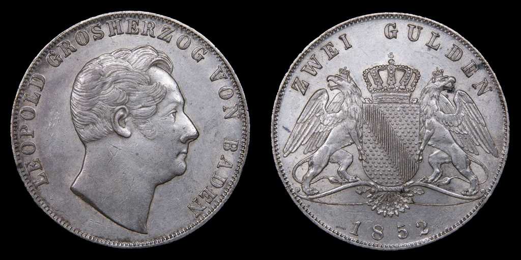 Lote 379. Alemania. Gran Ducado de Baden. Leopold I (1830-1852) 2 Gulden 1852. Baden-Württemberg mint. Plata 900; 36.0mm; 21.24g. Emisión de 141.860 ejemplares. KM222 (XF)