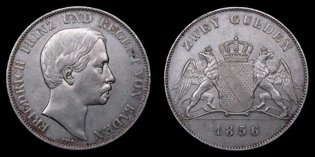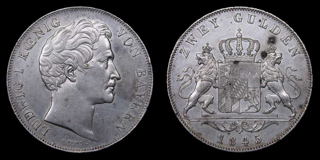 Seguimos por las piezas en denominación tipo Gulden, sistema unificado bajo el Tratado Monetario de Múnich de 1837 que establecia el mismo estándar (900 de fino, 21,00g de peso aproximadamente) entre los estados de Baden, Baviera, Frankfurt, Hesse-Darmstadt, Nassau y Wurtemberg y al que más tarde se unieron también Hesse-Homburg, Hohenzollern-Hechingen, Hohenzollern-Sigmaringen, Sajonia-Meiningen y Schwarzburg-Rudolstadt. A continuación veremos cinco de esos estados de la Confederación Germánica representados:
