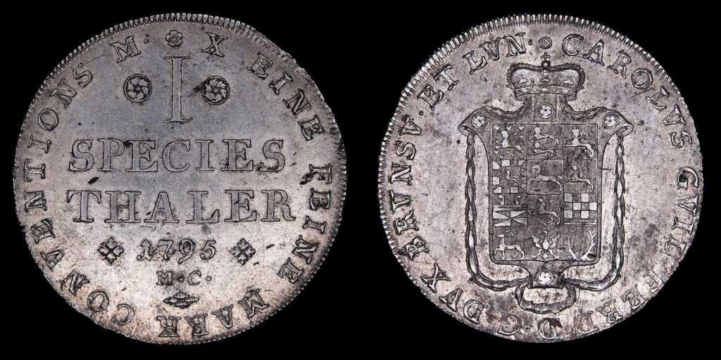 Presentamos también dos piezas del tipo «Species Thaler», moneda en el estándar imperial del Sacro Imperio Romano Germánico que poseia un alto fino (de 833 a 900) con un peso aproximado de unos 28,00 a 29,00g. En estas piezas, en comparación a otros estándares, el valor intrínseco equivalía al valor facial: